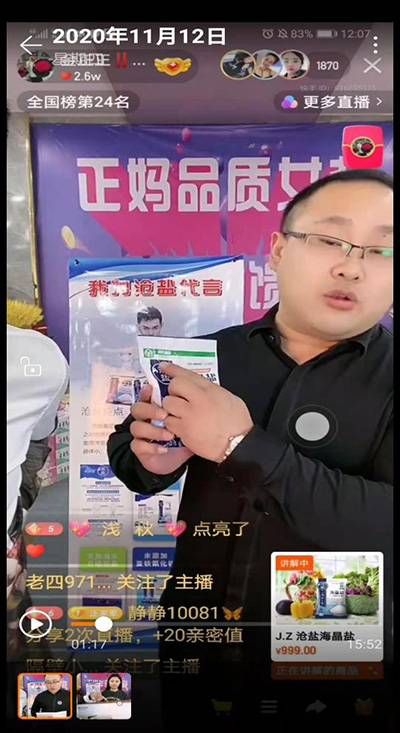 銀山食鹽公司銷售科副科長郭帥負責相關業務聯系,并全程跟進、及時溝通、全力配合快手平臺開展工作。在“雙節”期間,曾一度因銷售火爆導致客服無法滿足售后服務。從直播帶貨至今,歷時20多天的時間里,共計銷售“滄鹽”牌小包裝食用鹽500余噸,其中海晶鹽107噸、精晶海鹽200噸,粉碎洗滌鹽200噸,開創了線上主播帶貨銷售的先河,成為敢于在線上(快手平臺)食鹽銷售第一個“吃螃蟹”的人。
