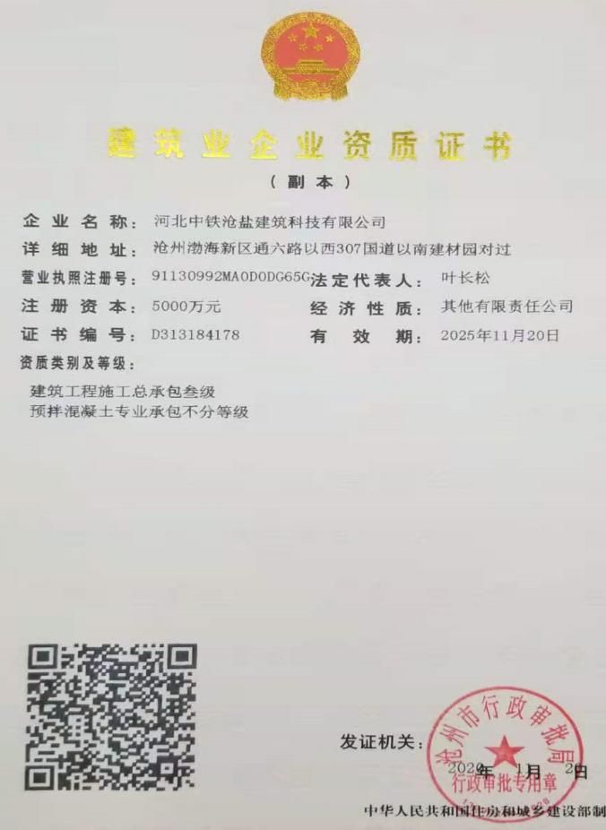 日前,河北中鐵滄鹽建筑科技有限公司經過積極跑辦,如期取得了建筑工程施工總承包叁級和預拌混凝土專業承包不分等級兩個資質。