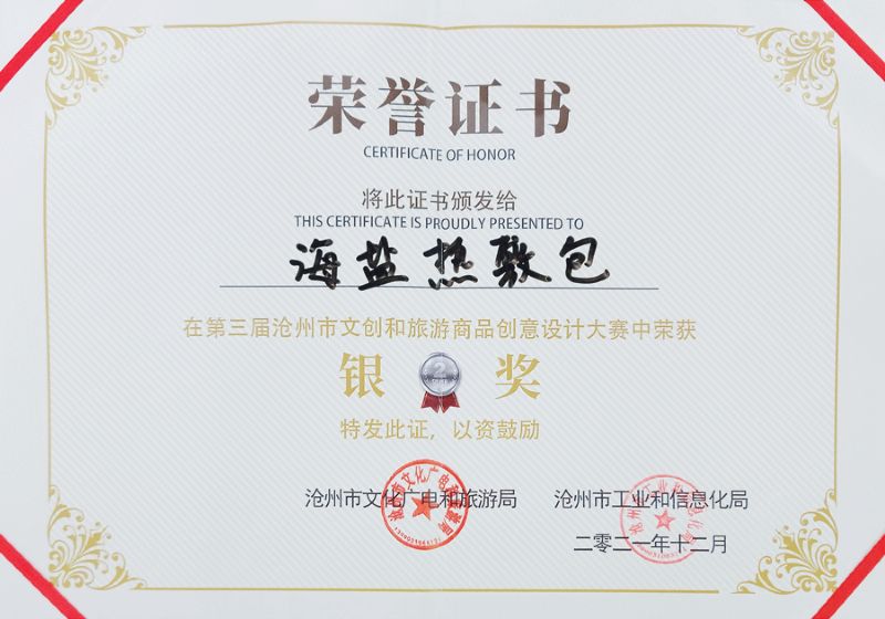 本次大賽是由滄州市文化廣電和旅游局、滄州市工業和信息化局聯合舉辦。在歷時6個月的比賽中,“滄鹽”牌海鹽熱敷包(宮廷款)最終脫穎而出,代表渤海新區進入決賽,并經過決賽路演、專家評審榮獲銀獎。此獎項也是渤海新區參賽商品中的最高獎項。