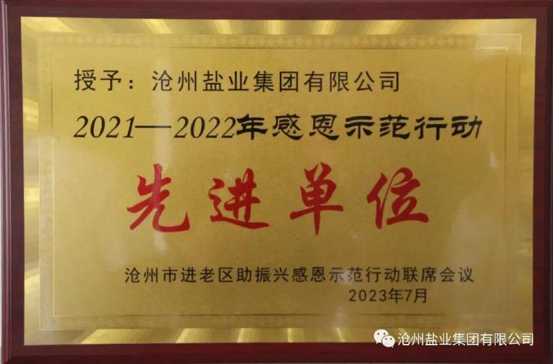 2023年7月,集團公司被滄州市進老區助振興感恩示范行動聯席會議授予“2021—2022年感恩示范行動先進單位”榮譽稱號。