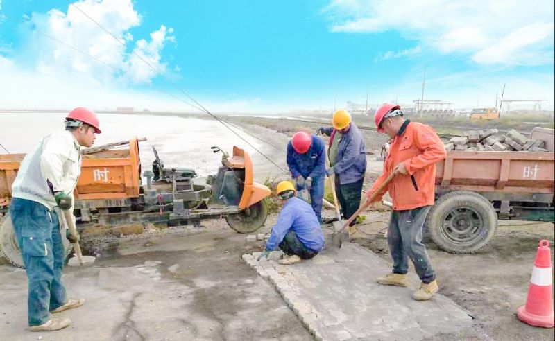 9月29日,建筑工程公司施工科職工早早來到施工現場,提前準備好發電機、水泥、連鎖塊、沙子、石子等工具材料,通過對現場勘查,制定出修補辦法。按照修補方案,職工們開始了道路修補工程。修補施工現場,一派忙碌的景象,職工們有砌磚的、有拌灰的、有灌縫的,電鎬的沖擊聲、發電機的轟鳴聲與職工忙碌的身影交匯在一起,成為一道亮麗的風景線。