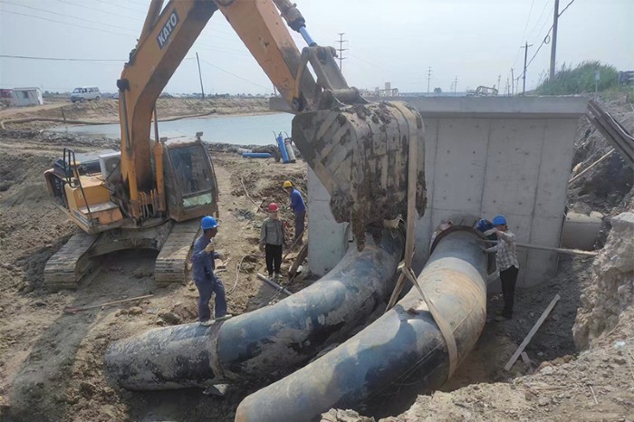 截至6月25日,漣洼排干北鹵南輸泵站輸水管道焊接工程已完成150米。