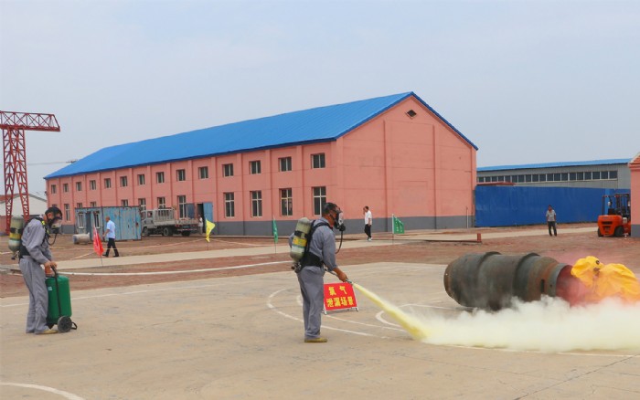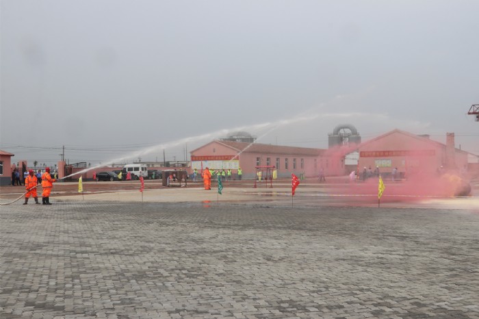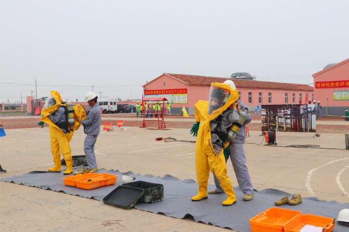 此次演練模擬了機械傷害、中暑、觸電、火災、溴素燙傷、氯氣泄漏六個事故場景。演練開始前,進行了空呼機穿戴、全封閉防化服穿戴、空呼機穿戴30米跑、消防等技能比武活動。
