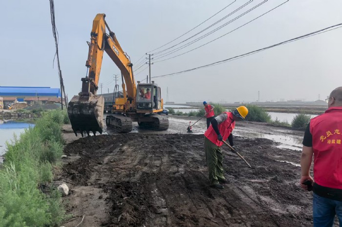 連日來,強降雨持續不斷,為道路鋪設帶來很大的困難, 施工負責人現場指揮督導,職工們一邊下管排水一邊鋪設道 路,將“工期意識 ”、“責任意識 ”融入每一個施工細節, 在保證工程質量和施工安全的前提下,全力以赴加快臨道鋪 設速度。