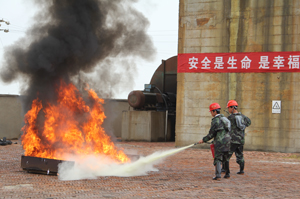 在模擬火災現場,現場人員發現火情及時報告,演練指揮中心立即向救援突擊隊下達救援滅火命令。救援突擊隊第一時間進入現場,救援人員使用干粉滅火器對準火源實施滅火。由于火勢太大,演練指揮中心下達啟動消防設施的命令。救援突擊隊立即開啟消防水泵,迅速將火撲滅。