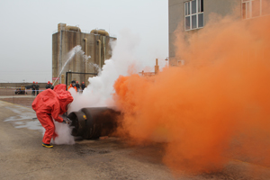 與此同時,在模擬液氯鋼瓶泄漏救援演練現場,液氯鋼瓶發生泄漏,工作人員立即拉響警報器,救援人員一面組織現場人員用濕毛巾捂住口鼻,向上風口方向緊急疏散;一面佩戴專業空氣呼吸器,身著防化服,破開車間門、窗,用液氯捕消器對泄漏源實施捕消和封堵。救援人員發現現場有一人氯氣中毒后,立即報告給演練指揮中心,指揮中心立即派出2名救援隊員用擔架將傷者移至安全地帶,并組織醫護人員迅速對傷者實施搶救。消防人員則馬上啟動消防設施,進行水霧空中噴灑,中和、吸附泄漏到空氣中的氯氣,降低危害程度,控制事故范圍。事故處理完畢后,經現場毒氣檢測,空氣中氯氣含量降至安全水平。至此,中鹽長蘆滄州鹽化集團有限公司2013年應急救援實戰大演練到此結束。