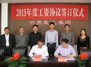 4月29日上午,公司舉行2015年度工資協議簽訂儀式,企業方首席代表、董事長劉建軍,職工方首席代表、工會主席李金營,分別在協議書上簽字。