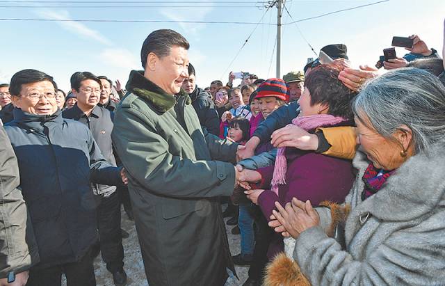 2017年1月24日,中共中央總書記、國家主席、中央軍委主席習近平來到河北省張家口市,看望慰問基層干部群眾,考察脫貧攻堅工作。這是習近平在張北縣小二臺鎮德勝村看望慰問村民,向鄉親們拜年。(資料片)新華社發