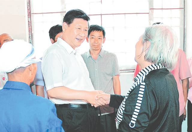 2013年7月11日至12日,中共中央總書記、國家主席、中央軍委主席習近平在河北省調研指導黨的群眾路線教育實踐活動。這是習近平在平山縣西柏坡革命舊址同當地群眾握手交談。(資料片)新華社發