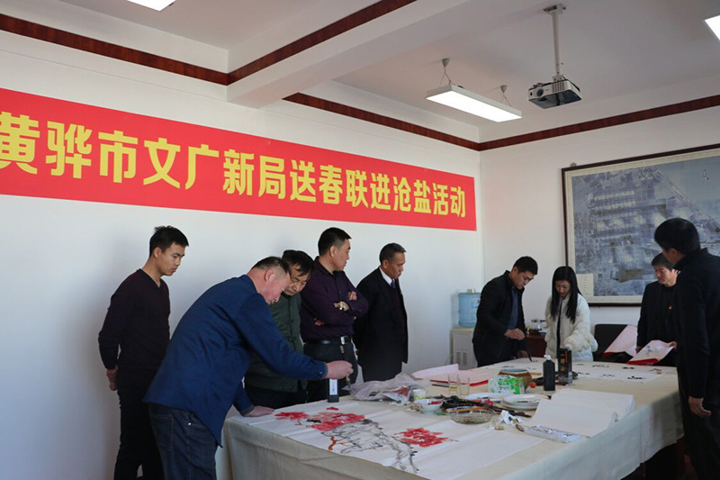 2月2日,黃驊市文廣新局組織本市6位知名書畫家到公司開展“送春聯·進滄鹽”活動。在活動現場,書畫家們潑墨揮毫、妙筆生花,不僅書寫了100余幅象征幸福團圓的福字和春聯,而且深情地描畫出象征富貴吉祥的“牡丹圖”等繪畫作品,營造出喜慶祥和的節日氛圍。
